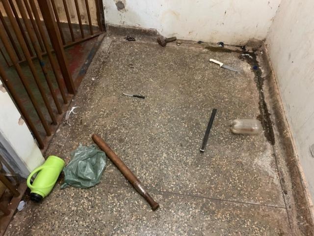 Equipes da perícia foram acionadas para avaliar o local. Marcas na porta dos fundos indicam o arrombamento e na cela onde o homem estava foram encontradas facas, martelos e um taco de beisebol.