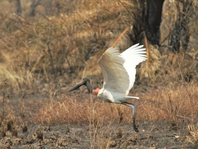 Ainda nesta propriedade uma mãe tuiuiú se manteve firme e forte no ninho onde estavam seus filhotes. Em meio a tanto cinza, a plumagem e o bico das aves pantaneiras era o único resquício de cor.