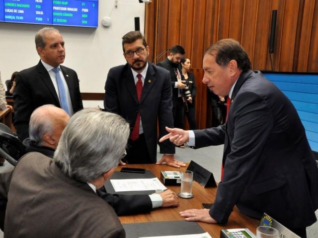Deputados Carlos Alberto David (PSL), Pedro Kemp (PT), Gerson Claro (PP), Onevan de Matos (PSDB) e Londres Machado (PSD), durante sessão (Foto: Luciana Nassar/ALMS)
