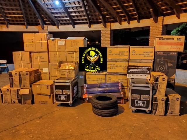 Foram apreendidas duas caixas de som amplificadas, quatro volumes com canhões de luz, oito caixas de som, dois auto falantes, vinte caixas de LED, dez caixas de strobe, quatro caixas de pedestais, uma mesa de som, uma caixa com conectores para microfones sem fio, uma caixa de lâmpadas de LED, dois pneus aro 14 e ainda um volume com placas eletrônicas.
