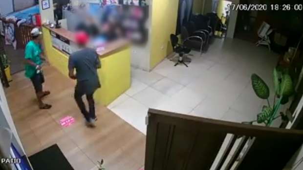 Segundo informado pelas vítimas, o assalto ocorreu por volta das 18h20 de quarta-feira (17). Nas imagens, a dupla armada rende os funcionários do balcão e ‘tacam o terror’.
