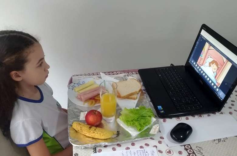Isadora dos Santos Silva, aluna do 3º ano do Ensino Fundamental da Escola do Sesi de Três Lagoas. Cada aluno montou e apresentou na web aula seu lanche saudável, classificando cada item