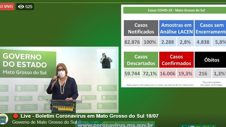 Em nova atualização do boletim do coronavírus em Mato Grosso do Sul, a SES (Secretaria de Estado de Saúde) contabilizou um total de 216 mortes no Estado até este sábado (18). Apenas neste sábado, conforme o secretário de saúde, Geraldo Resende, foram 13 novos óbitos registrados no Estado.