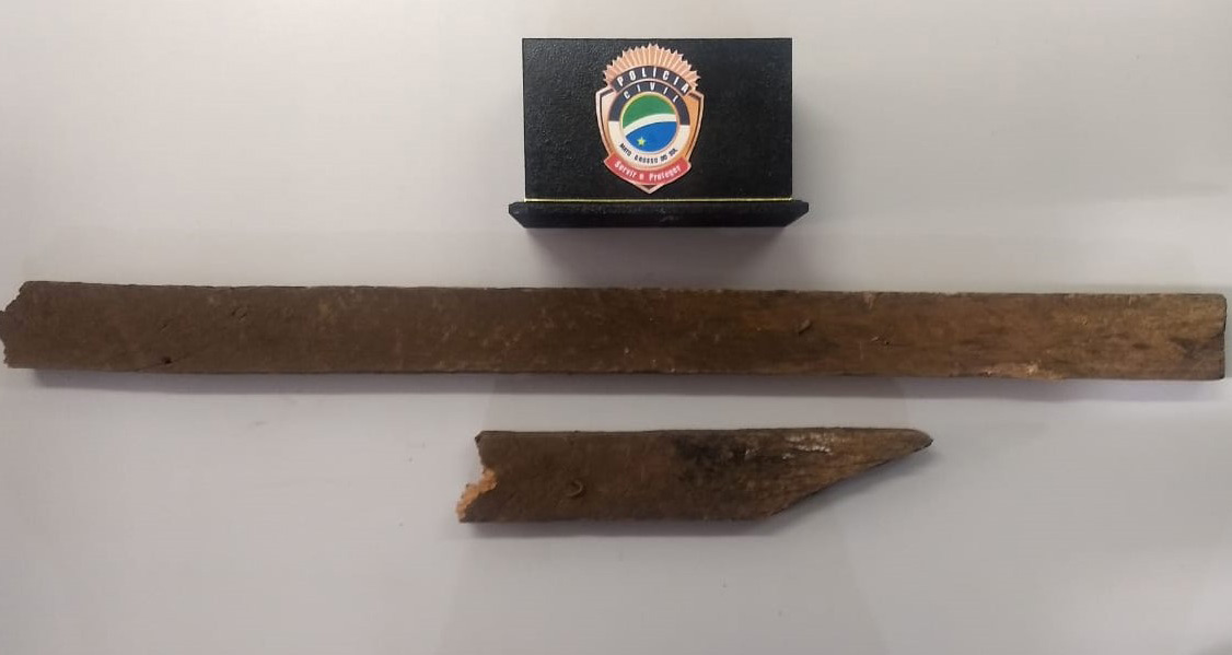 Vítima levou paulada, teve traumatismo craniano e permanece internada. Pedaço de madeira usado para golpear a vítima (Foto: Divulgação/Polícia Civil)