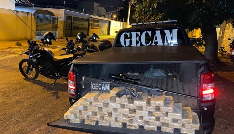 Ele correu para dentro da casa. Os policiais entraram e encontraram a espingarda com luneta na cozinha e uma bolsa com várias munições. Em uma busca no interior da casa, uma bolsa com vários tabletes da droga foi encontrada sendo um total de 44 tabletes.