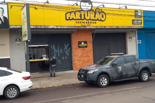 Policiais nesta sexta-feira (21) em frente a empresa Farturão, em Campo Grande.