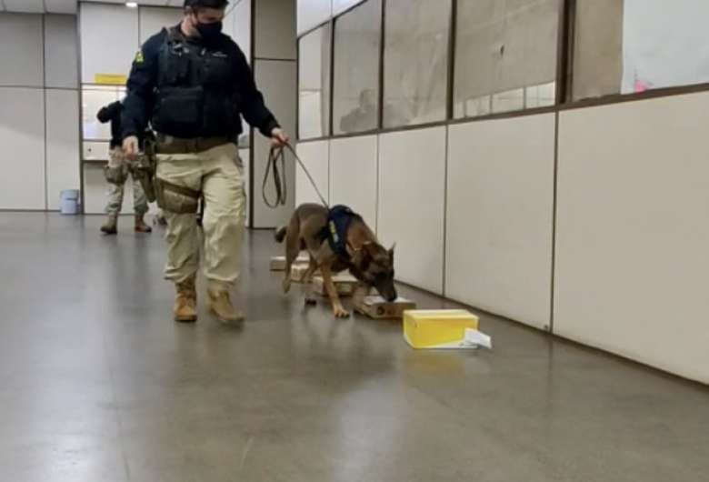 Os cães farejadores do Grupo de Operações com Cães da PRF (GOC/MS), Chacal e Bella, da raça Pastor Belga Malinois, e Alpha, da raça Pastor Alemão, indicaram positivamente para o odor de drogas nas encomendas.