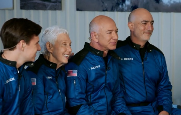 Bezos, fundador da empresa de comércio eletrônico Amazon, e seu irmão Mark Bezos, se juntaram a outros dois. A aviadora pioneira Wally Funk, de 82 anos, e o recém-formado no ensino médio Oliver Daemen, de 18 anos, que juntos se tornaram, respectivamente, a pessoa mais velha e a mais jovem a chegar ao espaço.