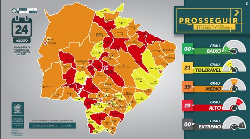 Dos 79 municípios de Mato Grosso do Sul, 19 estão enquadrados com grau alto – bandeira vermelha – na classificação de risco para a pandemia de Covid-19 do programa Prosseguir, do governo do estado, que foi divulgada nesta terça-feira (24). As medidas que ainda seguem expostas passam a valer a partir desta quinta-feira (26).
