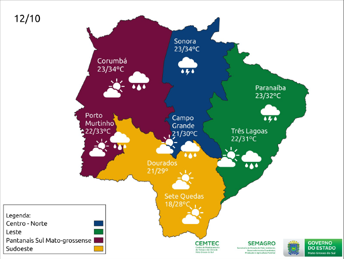 Confira no mapa elaborado pelo Cemtec as condições esperadas para algumas regiões do Estado neste dia 12 de outubro.