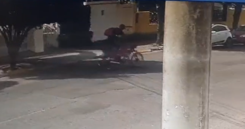 Câmera de segurança flagrou o momento em que o suspeito sai empurrando o veículo sem capacete