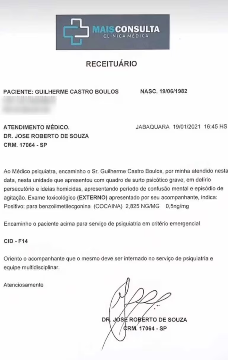 Em seguida, o médico passa a descrever o que seria o exame toxicológico de Boulos, apresentado por um acompanhante dele. “Indica positivo para benzoilmetilecgonina, cocaína”, diz o documento.