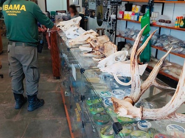 Uma exposição ilegal de partes de animais silvestres foi alvo de fiscalização do Instituto Brasileiro do Meio Ambiente e dos Recursos Naturais Renováveis (Ibama), em Campo Grande na última terça-feira (19). Com base em uma denúncia, os agentes encontraram diversos produtos da fauna dispostos para venda: cabeças de onças pintadas (Panthera onca) e pardas (Puma concolor), de queixadas (Tayassu pecari) e de jacarés (Alligatoridae); arcadas dentárias de tubarão; chifres de cervo-do-pantanal (Blastocerus dichotomus); e “troféus” de cabeças dos peixes pintado (Pseudoplatystoma corruscans) e dourado (Salminus brasiliensis).