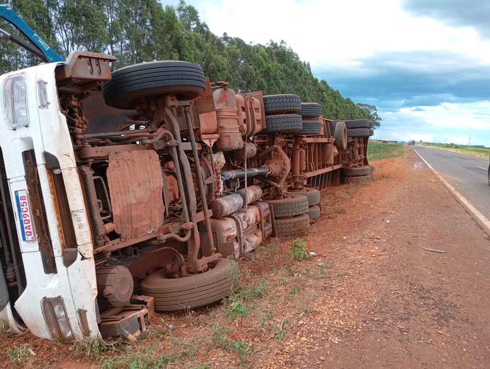Uma carreta carregada com gado tombou na MS-134, em Nova Andradina, na tarde desta terça-feira (21).
