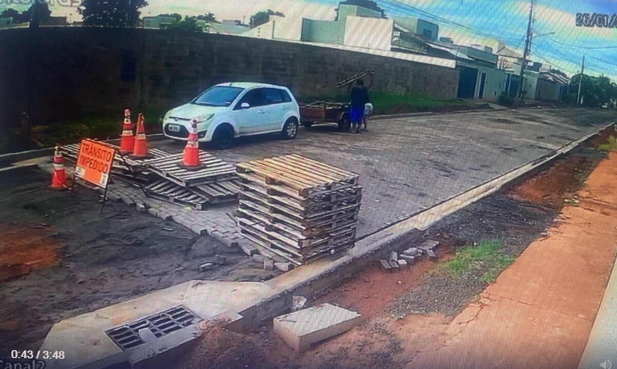 Na manhã deste domingo (26), um casal ainda não identifica foram flagrados pelo sistema de segurança roubando paletes que estava sendo usados em uma construção no Jardim Itatiaia, em Campo Grande.