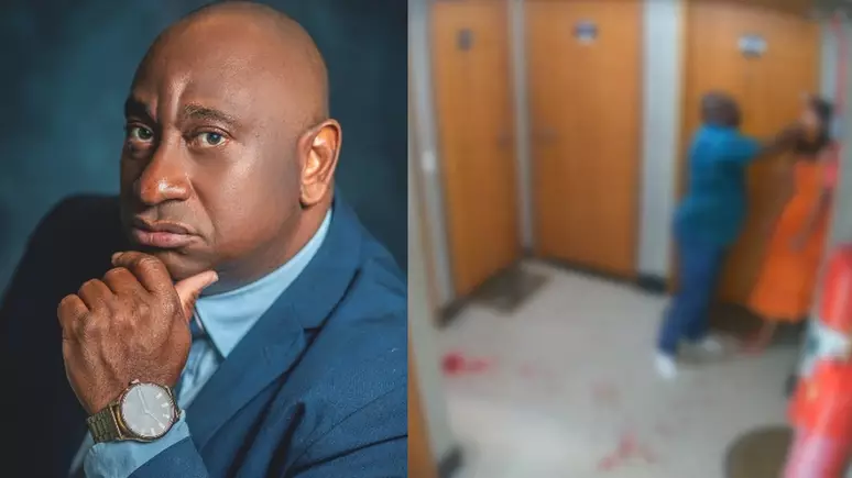 Câmeras de segurança do condomínio registraram o momento em que a vítima aparece ensanguentada no corredor do prédio, sendo pressionada contra a parede por João Neto, que tenta estancar o ferimento com um pano.