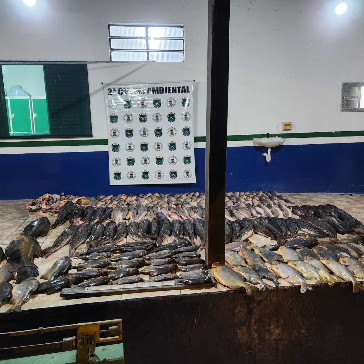Durante a abordagem a uma embarcação que realizava o transporte de pescado, os policiais localizaram grande quantidade de peixes armazenados em sete caixas, uma bolsa térmica e um freezer. Entre as espécies identificadas estavam cachara, pintado, tambaqui, barbado, pacu, piavuçu e piraputanga jurupoca, piranha e palmito.