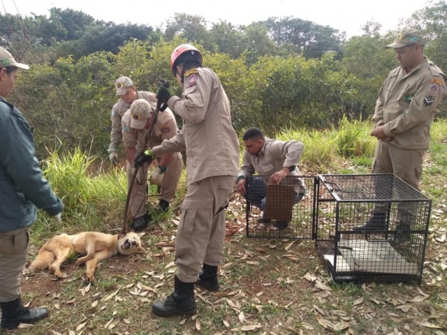 Embora debilitado e machucado, o cachorro apresentou comportamento bastante agressivo e foi preciso usar um enforcador para colocá-lo na gaiola de transporte.