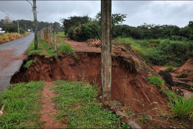 e atingiu Campo Grande, ontem (12) e hoje (13). A voçoroca (fenômeno geológico que consiste na formação de grandes buracos causados pela água da chuva e solo arenoso) avançou em direção a rua, derrubando a cerca e um pedaço do asfalto.