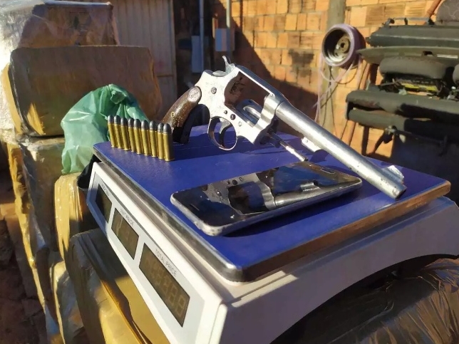Balança, celular, e revólver apreendidos na oficina. (Foto: Choque)