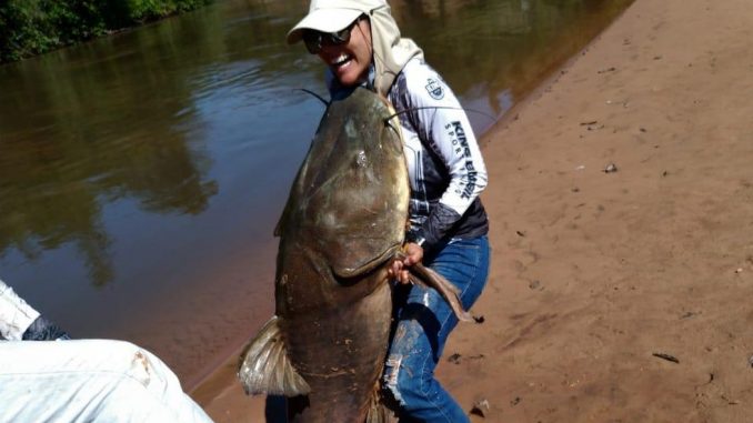 A dentista Nicele Furtado de Freitas, de 37 anos, capturou no último sábado (13) um peixe de 80 quilos e de 1,73 metro de comprimento no rio Jauru, em Alcinópolis, região norte de Mato Grosso do Sul.