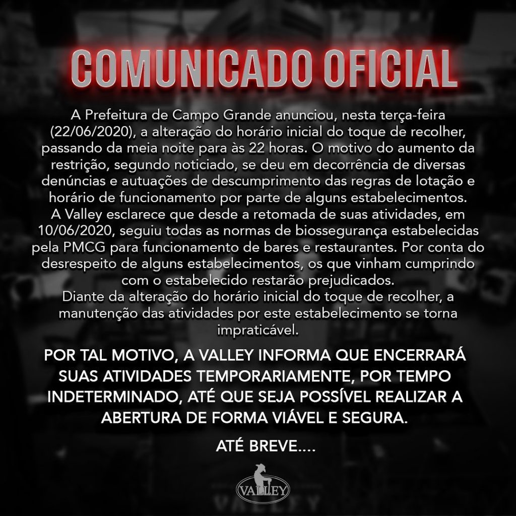 A casa de shows Valley, que recentemente retomou as atividades, anunciou nesta terça-feira (23) que encerrará, temporariamente, as atividades em decorrência da alteração no horário do toque de recolher, em Campo Grande.