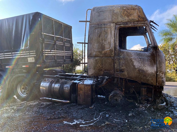 Uma carreta foi Volvo foi parcialmente destruída por um incêndio na manhã deste domingo (28), no quilômetro 741 na BR-163, próximo a base da CCRMS Via nos limites territoriais de Coxim, na região Norte do Estado.