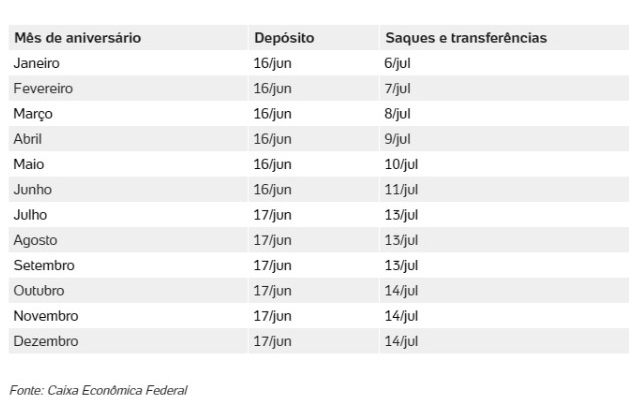 Os saques e transferências serão realizados conforme o mês de nascimento do trabalhador e vão até o dia 14 de julho. Esses trabalhadores já tiveram o dinheiro liberado na poupança social digital entre os dias 16 e 17 de junho. Conforme calendário abaixo: