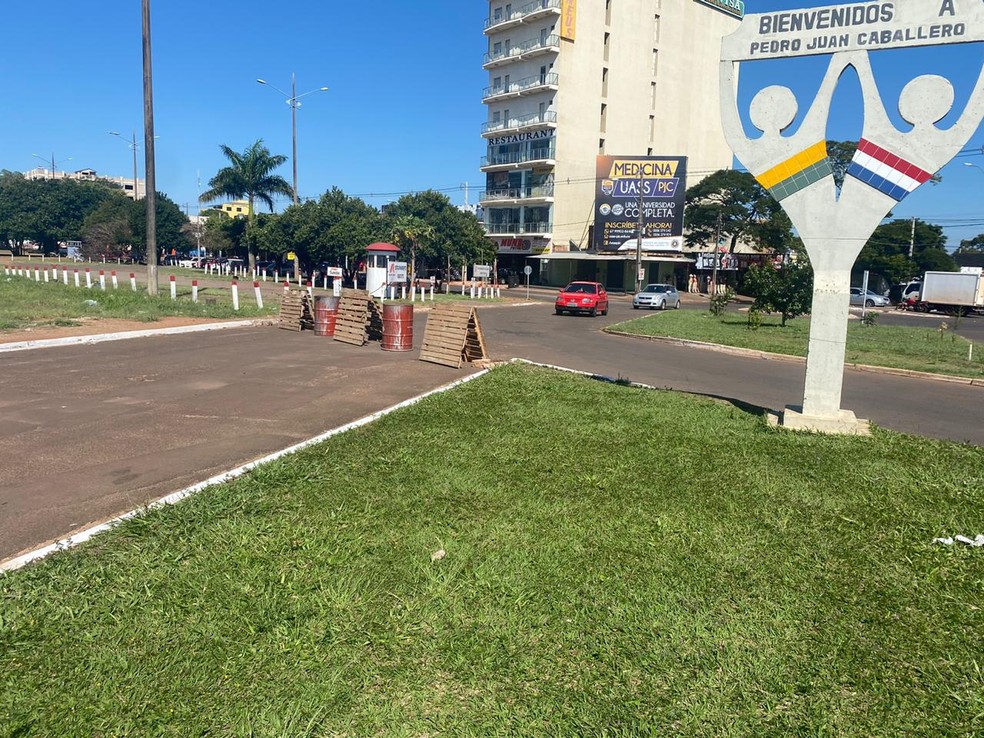 Segundo a Câmara Lojista de Pedro Juan, 30% das pessoas que perderam emprego são brasileiras. Monumento de boas vindas ao lado da barreira com arame farpado, tambores e placas de pinus — Foto: Martim Andrada/TV Morena
