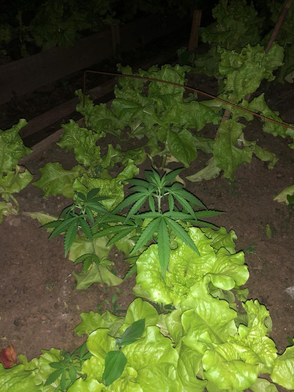 Polícia encontrou 55 ‘pés’ da planta na horta, mudas, o próprio entorpecente e balança de precisão. (Maconha em meio a hortaliças — Foto: Polícia Civil/Divulgação)