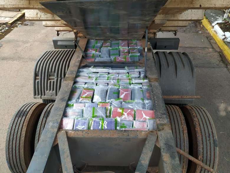 Ele afirmou aos policiais que levava apenas pneus novos, no entanto, após vistoria minuciosa, um fundo falso foi localizado com diversos tabletes de cocaína.