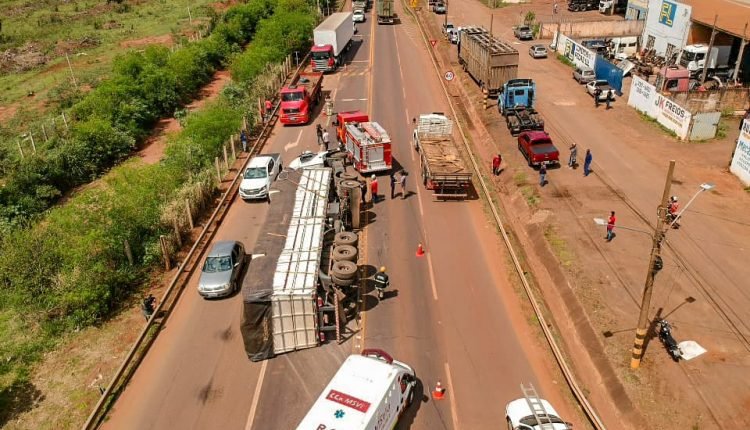 Motoristas que passam pela região estão usando o acostamento já que o caminhão ainda está tombado no meio da pista. A PRF (Polícia Rodoviária Federal) foi acionada para o local.