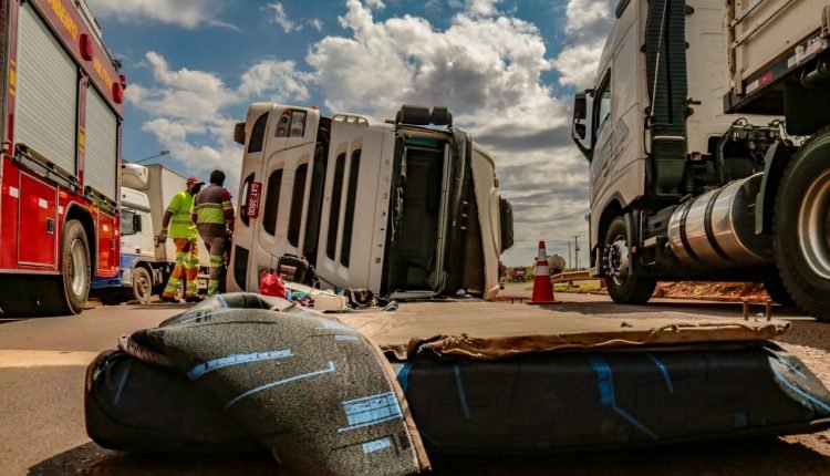 TRÂNSITO – Carreta com carga de algodão tomba e fecha BR-163 em Campo Grande, veja as imagens.