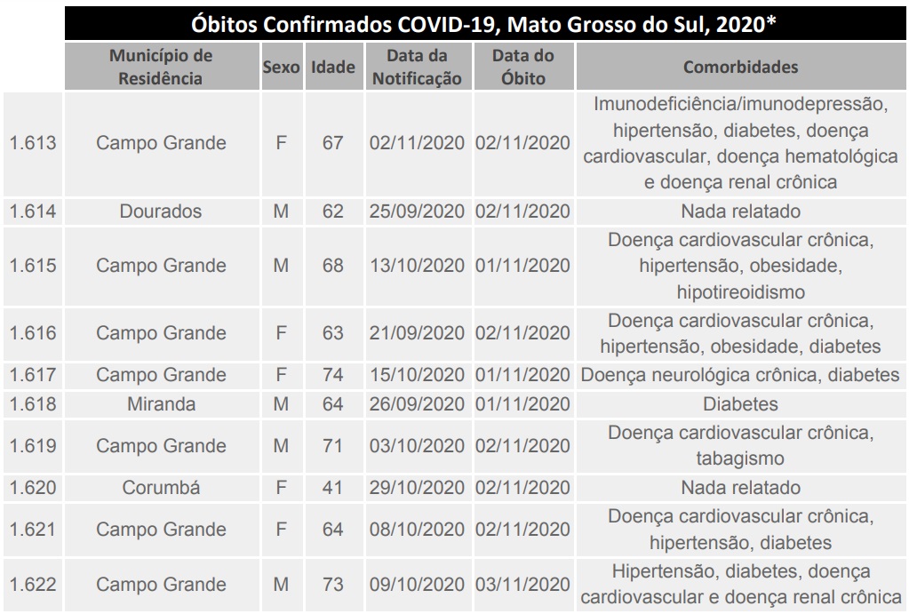 Foram registrados no boletim do coronavírus, 10 óbitos, sete em Campo Grande, e três municípios registraram uma morte, foram Corumbá, Dourados e Miranda. Dos óbitos registrados em 24h, aconteceu um caso no dia 1° de novembro, seis casos no dia 2 e outras duas mortes no dia 3 deste mês. As mortes foram de 41 a 74 anos de idade, duas delas não tem nada relatado.