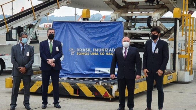 Para o recebimento da carga, estão presentes no local os ministros da Saúde Eduardo Pazuello, das Relações Exteriores, Ernesto Araújo, e das Comunicações, Fábio Faria. De lá, as vacinas serão encaminhadas para o Rio de Janeiro.