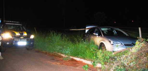 Os policiais realizaram um acompanhamento tático ao veículo e já na última rua do Jardim Campo Grande, o condutor acabou perdendo o controle direcional e adentrou em meio a vegetação, colidindo contra uma cerca de arame.