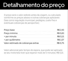 Em reportagem de julho de 2017, o valor da chamada custava R$ 2,50, e o quilômetro rodado era fixado em R$ 1,10, além de um adicional de R$ 0,15 por minuto. Verificando atualmente, os valores inclusive diminuíram alguns centavos. O valor da chamada custa R$ 2,43, o km rodado é fixado R$ 1,07. O adicional permanece o mesmo. Confira a imagem ao lado.