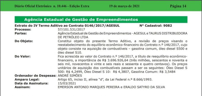 O dispositivo altera os preços praticados no contrato 146/2017, com a Taurus Distribuidora de Petróleo, aumentando o valor em R$ 3.696.926,64.