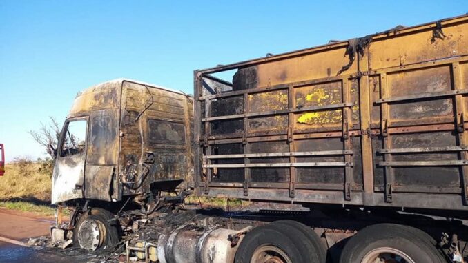Caminhão reboque Volvo, acoplado a uma carreta bitrem, ficou totalmente destruído após pegar fogo no final da tarde desta quinta-feira (22), às margens da BR-060, no município de Sidrolândia, distante 70 km da Capital.