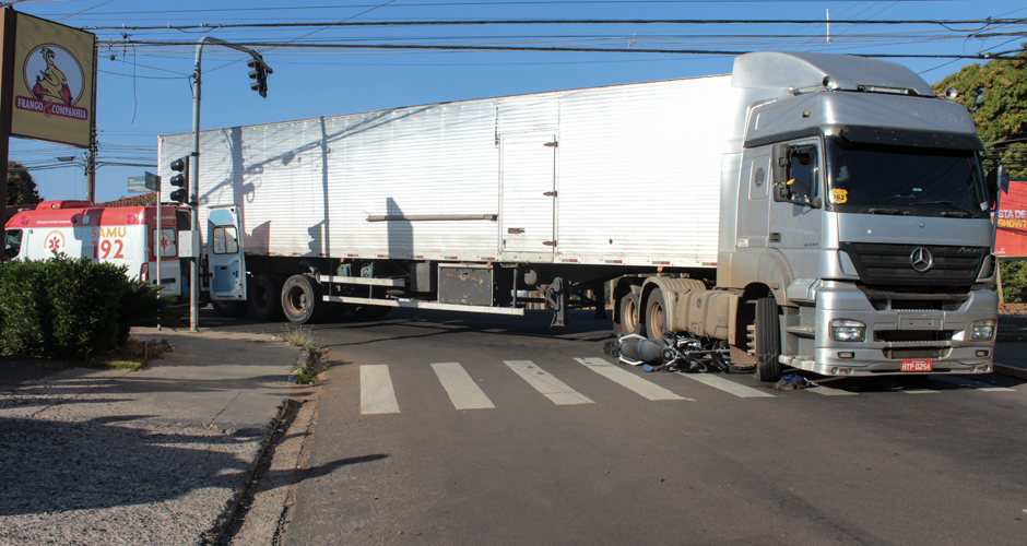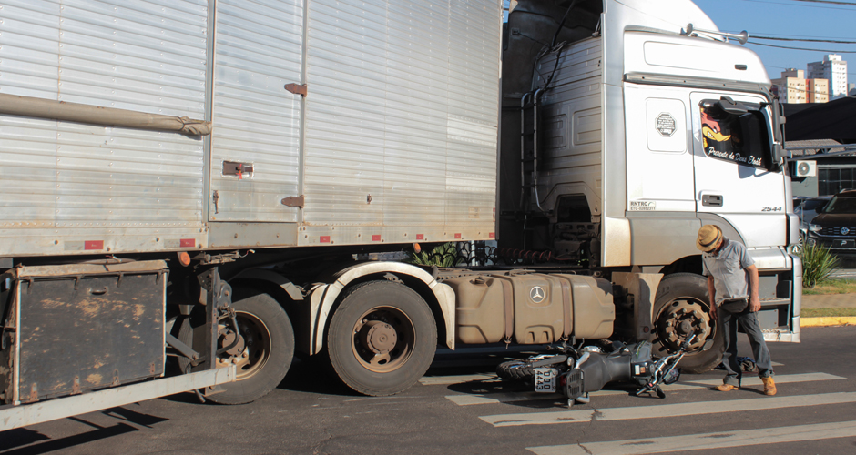 Apesar de motocicleta ter parado embaixo do caminhão, vítima teve apenas ferimentos leves