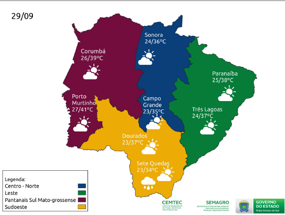 Nesta quarta-feira (29), o ar seco predomina na maior parte de Mato Grosso do Sul. Com nebulosidade apenas no extremo sul e na parte leste do Estado, as demais áreas terão predomínio de sol e tempo firme durante todo dia.