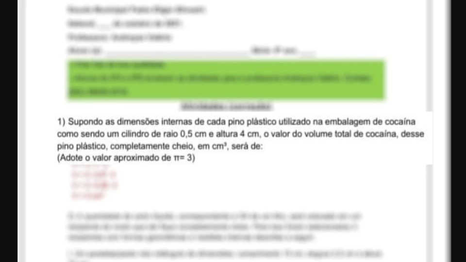 Lição de Matemática pede que alunos calculem volume de pino de cocaína