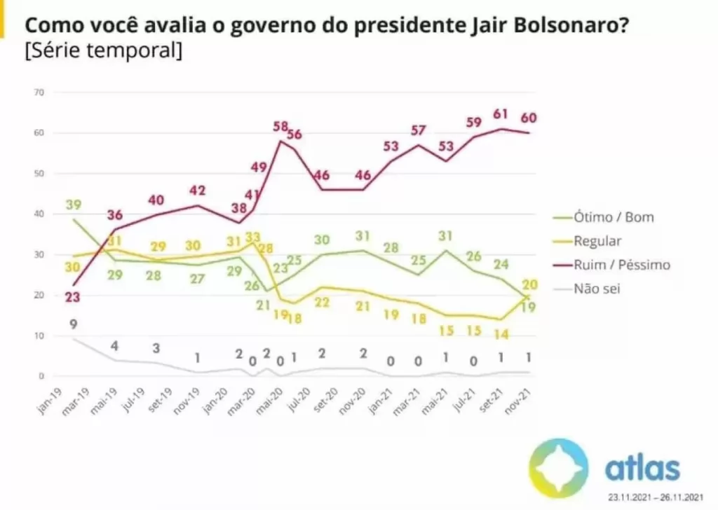 Nos números divulgados pelo levantamento, o governo Bolsonaro aparece abaixo de 20% pela primeira vez na série temporal. Realizada entre 23 e 26 de novembro, a pesquisa registra que 19% dos entrevistados avaliaram o governo do atual presidente entre ótimo e bom, enquanto 20% consideraram a atual administração regular.