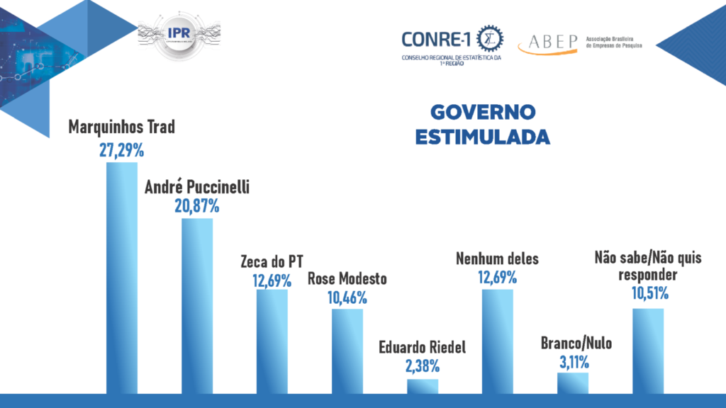 Eduardo Riedel é rejeitado por 7%, enquanto Rose por 6,18%. Marquinhos Trad é o menos rejeitado, com 6,13%, conforme o IPR. Já 14,3% não rejeitam nenhum, enquanto 8,51% não votam em nenhum. 7,05% não respondeu ou não sabia.