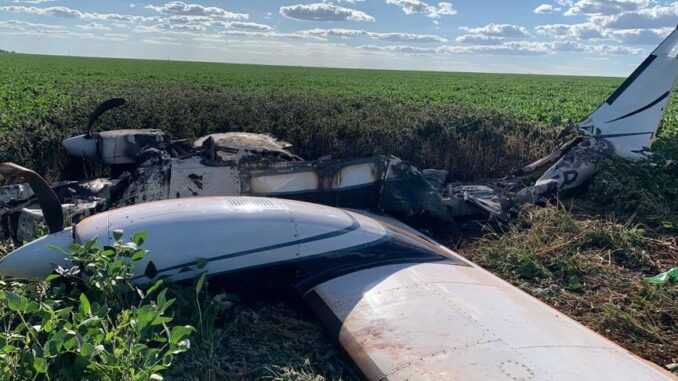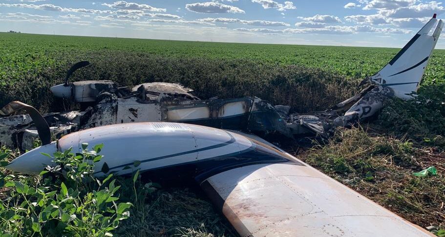 Um bimotor Sêneca matrícula PT-RTP caiu e acabou incendiado em meio a plantação de soja nesta quinta-feira, 9 de Dezembro. Os policiais do Departamento de Repressão à Corrupção e ao Crime Organizado (Dracco) estão no local apurando as circunstâncias.