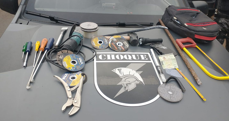 Boletim de ocorrência aponta que a mochiloa em posse de Carlos continha barra de ferro, pé de cabra cortado, talhadeira, ponteira, serra, conjunto de arco e serra, três chaves de fenda, chave Philips, chave canhão, lanterna, 25 discos de corte, disco de makita, alicate de pressão, alicate de corte, lixadeira marca Makita com disco de corte e marreta.