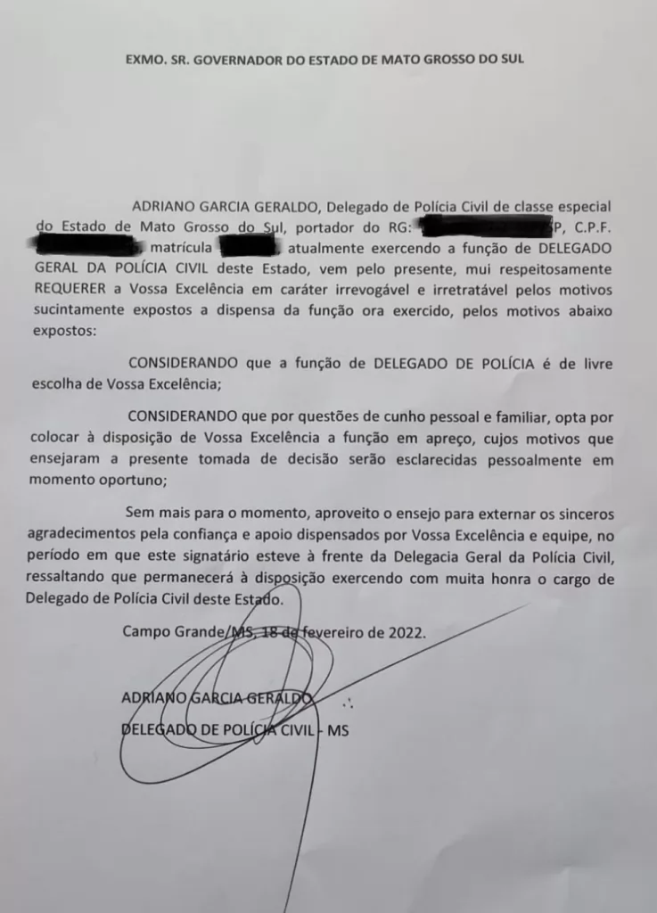 O delegado-geral da Polícia Civil de Mato Grosso do Sul, Adriano Garcia, pediu dispensa nesta da função através de uma carta enviada ao Governo do estado nesta sexta-feira (18). No documento, Garcia alegou motivos pessoais e familiares para deixar o cargo.