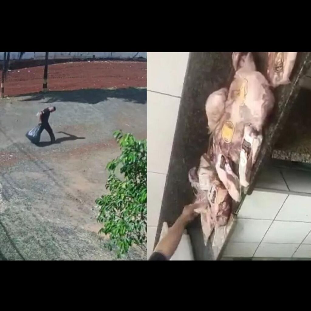As câmeras de segurança flagraram uma parte do esquema na segunda-feira (7). Conforme o registro, um funcionário furtava as peças de carne, colocava dentro de um saco preto e na hora do descarte deixava os produtos no lixo.