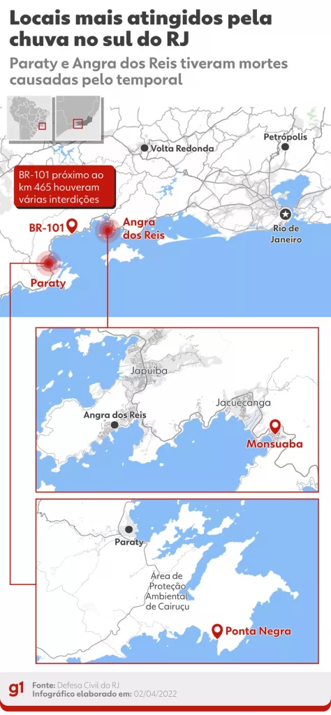 Bairros em Angra dos Reis e Paraty foram atingidos pela chuva — Foto: Editoria de Arte/g1