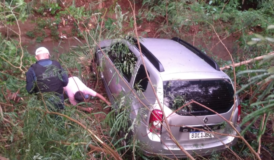 Mulher tem queda de pressão e carro cai em córrego